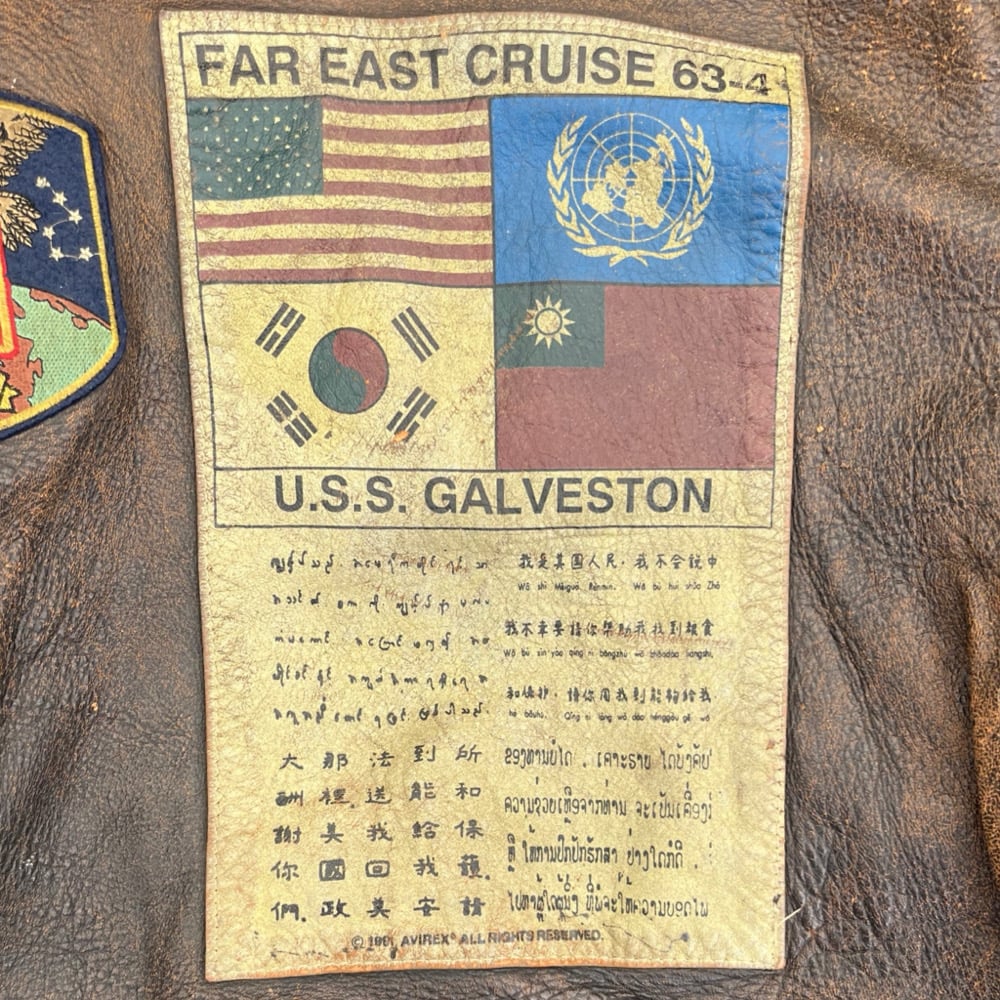 Il design è impreziosito da patch militari e navali ricamate (Seabees, USS William M. Standley, Texas Dallas, US Marines), rendendo questo capo un pezzo iconico da collezione.