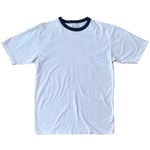Realizzata in tessuto 100% cotone di alta qualità, presenta un design essenziale con corpo bianco e collo a coste in blu navy, tipico delle forniture militari marittime.