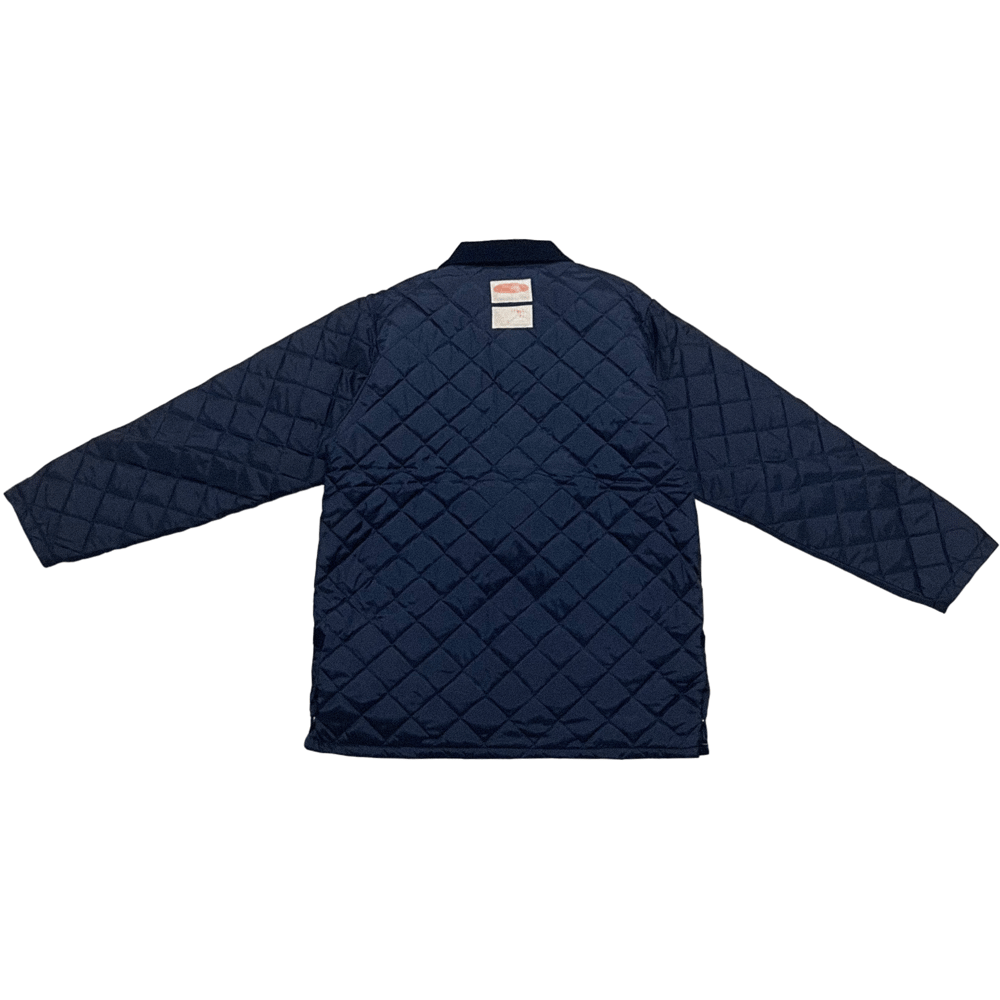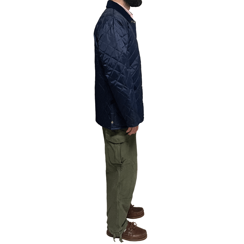 La superficie in nylon con trama a rombi introduce una lettura tecnica del classico tessuto trapuntato, pensata per garantire resistenza e leggerezza senza appesantire la struttura del capo.